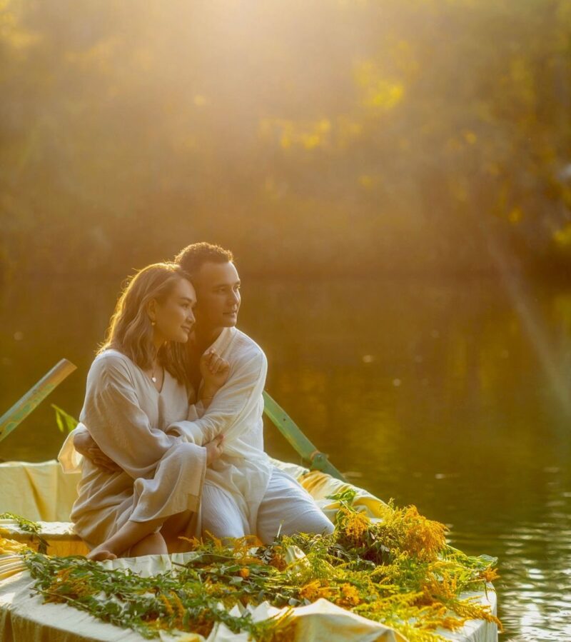 Күн сәулесіндегі атмосфералық кадрлар Әли мен Ақеркенің жанкүйерлерін баурап алды — жұп гүлдермен безендірілген қайықта суретке түсті. Олар ұқсас матадан жасалған киімдер киген.