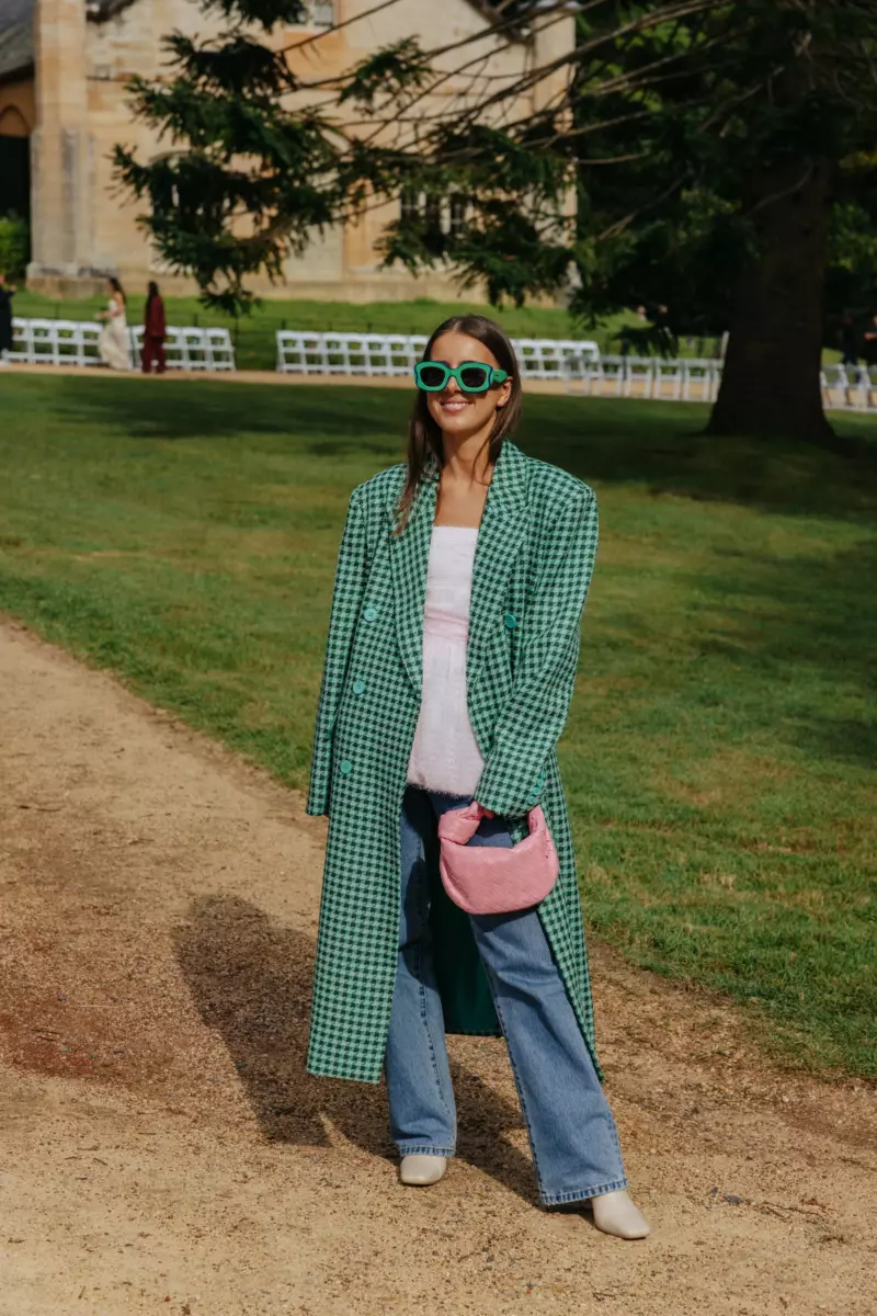 Розовая сумка может гармонировать с тоном пальто или куртки с особым принтом или даже привлечь еще большее внимание к узору. Например, зеленое клетчатое пальто в сочетании с джинсами и белым топом еще больше выделяется на фоне нежно-розового. Это гармонизирует образ, как у Шарлин Дэвис.