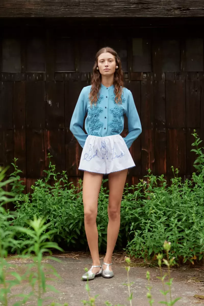 В этом сезоне Эмили Адамс Боде продолжает развивать свою уникальную концепцию моды, переплетая спортивные элементы, винтажные мотивы и искусную работу с тканями. На этот раз она обратилась к идее «пляжной пижамы» — образ, популярный в конце XIX века, когда женщины носили длинные туники поверх брюк у моря.