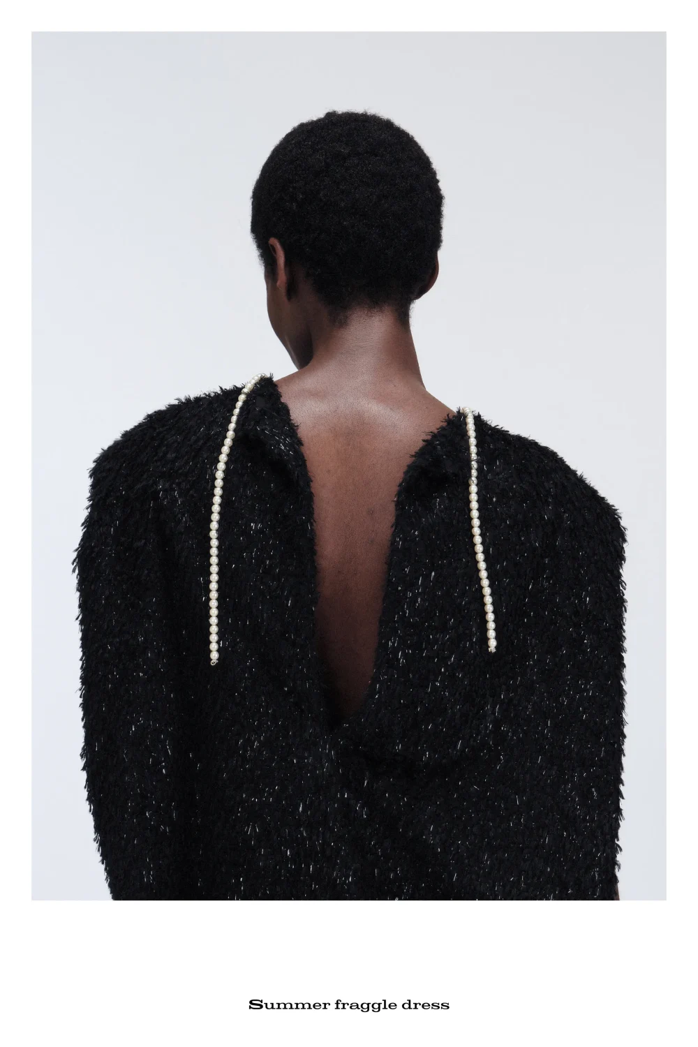 Коллекция выполнена в минималистичной палитре, сочетающей черный, белый и молочный оттенки. Но, несмотря на свою лаконичность, она полна тонких деталей, придающих каждой вещи особую индивидуальность. Пальто украшено булавкой, а платья обвивает жемчужная нить, изысканно подчеркивая линию спины.