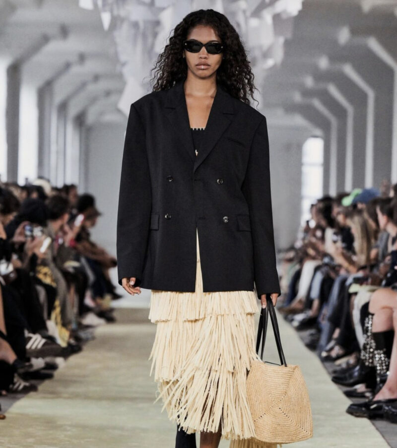 Коллекция, символично названная Paper (прим. ред. — «бумага»), отражала идею новой страницы — как в буквальном, так и в метафорическом смысле. «Я размышляла о том, что представлял из себя Nanushka за последние 20 лет, и о том, как он будет актуален в следующие 20. Это своеобразное переворачивание страницы в будущее», — поделилась Шандор. Визуальное воплощение задумки нашло свое отражение в деталях: платья, юбки и топы были украшены слоями необработанного поплина, напоминающего разорванную бумагу. Эти динамичные слои бахромы стали одними из главных элементов показа. В свою очередь, любовь дизайнера к ручной работе проявилась в других деталях: декоративная строчка расположилась на сумке Origami, а черный топ-бра был украшен контрастными швами.