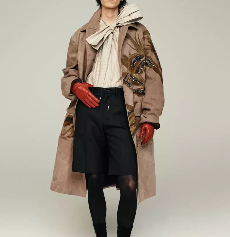 Вдохновением для новой коллекции Дома послужила книга Уильяма Берроуза «Дикие мальчики». Ее темная эстетика нашла отражение в образах, где смешиваются готика, уличный стиль и элементы сюрреализма. Изысканные ткани, такие как шелк и вязаные материалы, контрастируют с грубыми деталями — поясами-веревками и утилитарными элементами. Этот подход делает образы выразительными и нестандартными, добавляя в традиционные мужские силуэты эмоциональную глубину и легкий андрогинный акцент.