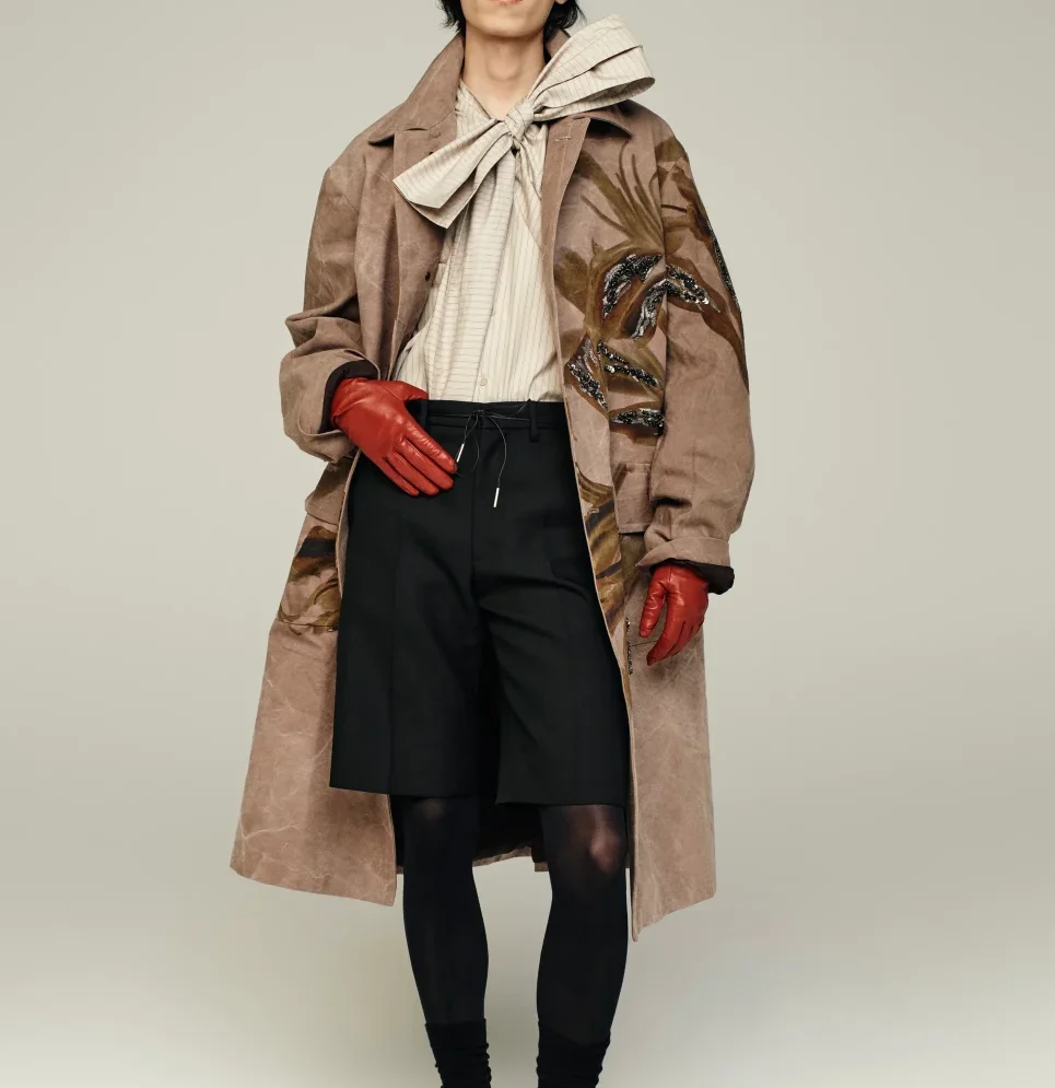 Герой DVN в этом сезоне выбирает длинное пальто с цветочными украшениями, воздушные кейпы, шелковые рубашки с бантами и косынки, которые словно переносят нас в мир, где время теряет свою привычную форму. Эти образы не только обозначают шаг вперед для бренда, но и открывают новые горизонты для мужской моды, где контрасты, детали и эмоции становятся основой.