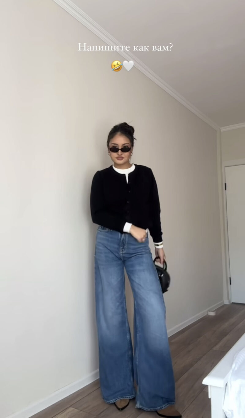 Еркежан Кайназарова, вдохновившись одним из ее выходов, решила показать своим подписчикам процесс составления образа в Instagram. Начала она с кардигана свободного кроя, который застегнула на пару пуговиц. Поддерживая этот тон, девушка выбрала такие же расслабленные джинсы, подчеркивающие ее фигуру.