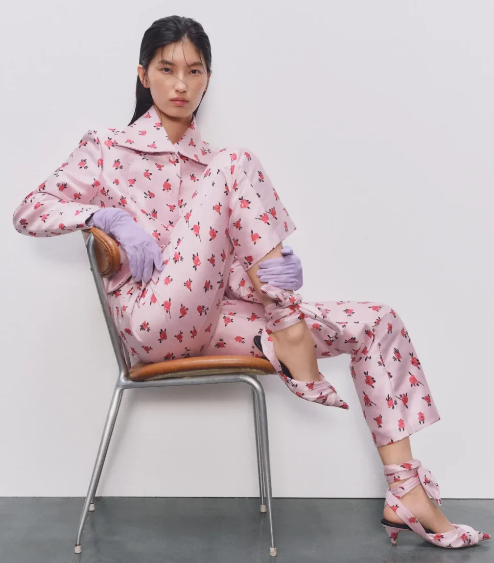 Отдельного внимания заслуживает игра с метериалами. Фаворит редакции — ткань, напоминающая винтажные обои с бутонами роз, из которой были выполнены брючные и юбочный костюмы.