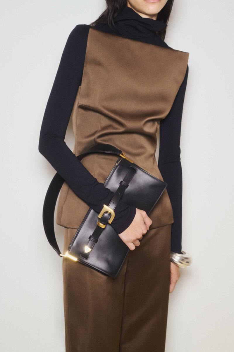 В этом сезоне дизайнер также решила минимизировать использование знаковой экокожи Okobor, ограничившись лишь созданием жакета в нежном шалфейном оттенке. Наряду с этим дебютировал новый аксессуар сезона — мини-сумка Harmonica с узнаваемой металлической пряжкой в форме буквы «N».