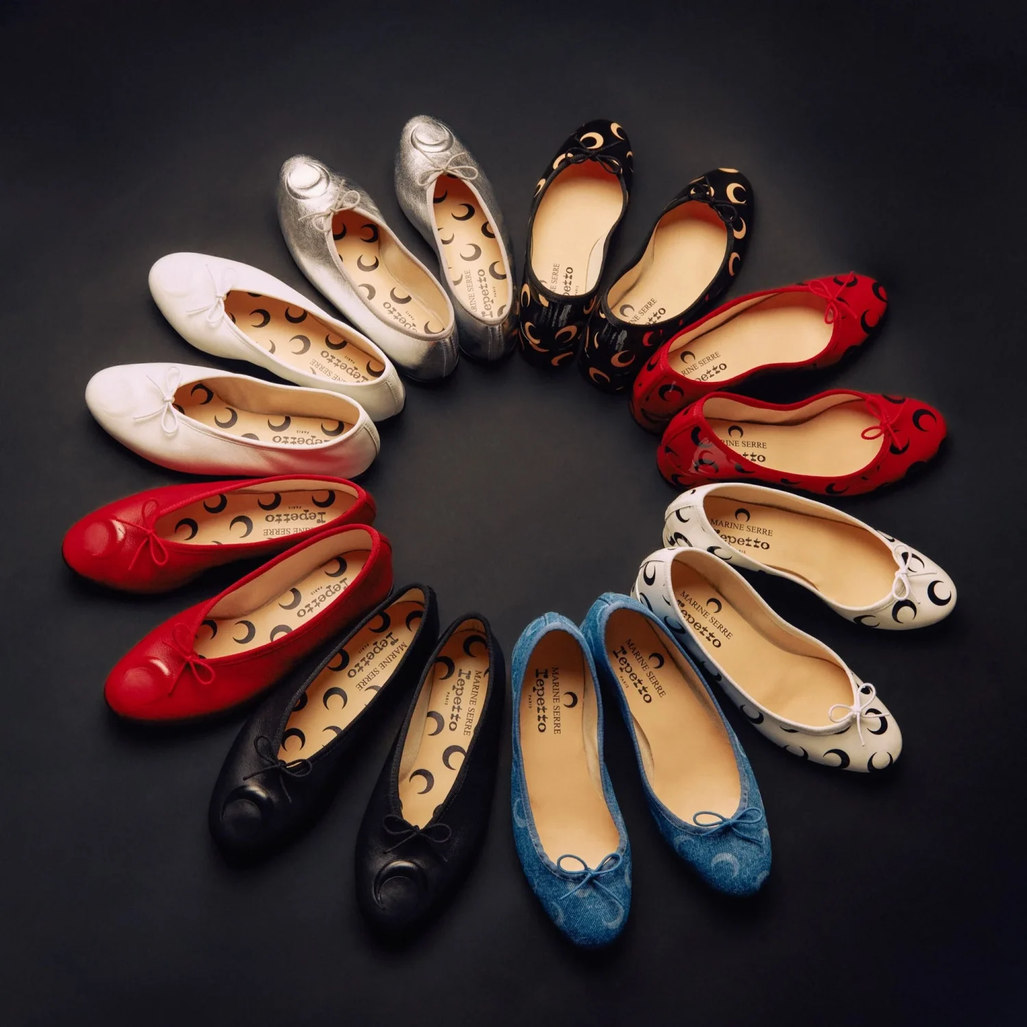 Марин Серр объединилась с легендарным французским брендом Repetto для создания коллекции, где балетная утонченность встречается с инновациями. В коллаборацию вошли две модели в самых разные цветовых решениях: босоножки Justine и балетки Camille, украшенные принтом All Over the Moon.
