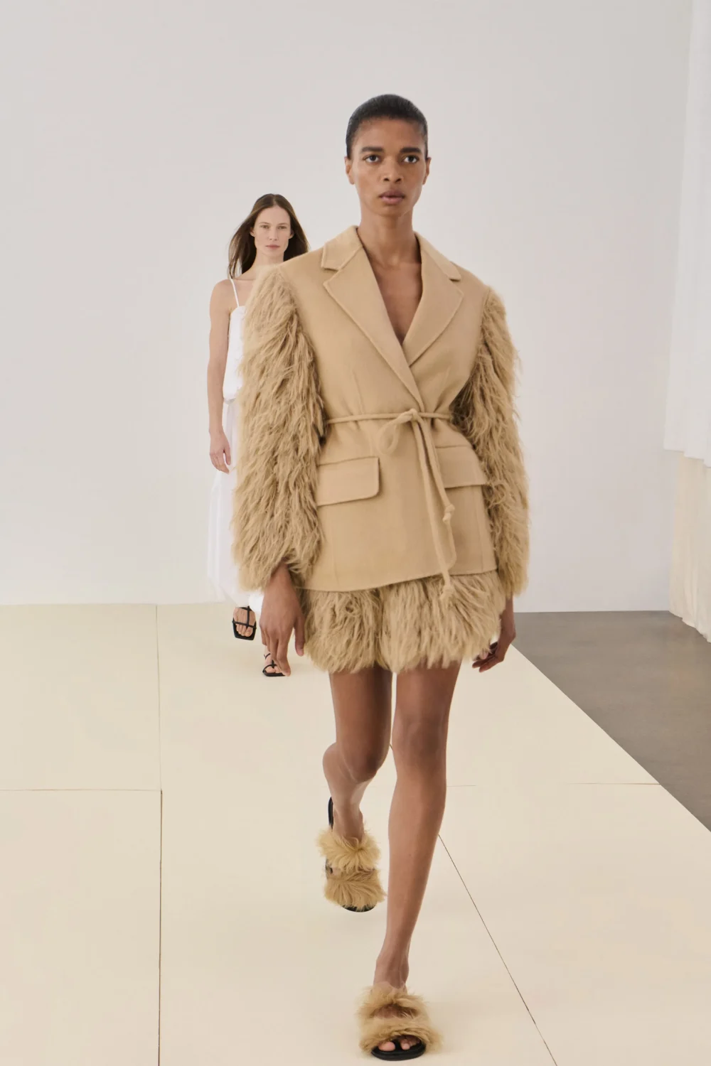 Однако коллекция не которые без смелых акцентов. Пальто и платье цвета кэмел украшены перьевыми рукавами, которые привносят элемент драмы, а топы и сумки — искусной вышивкой, вдохновленной садами старой Франции и Великобритании.