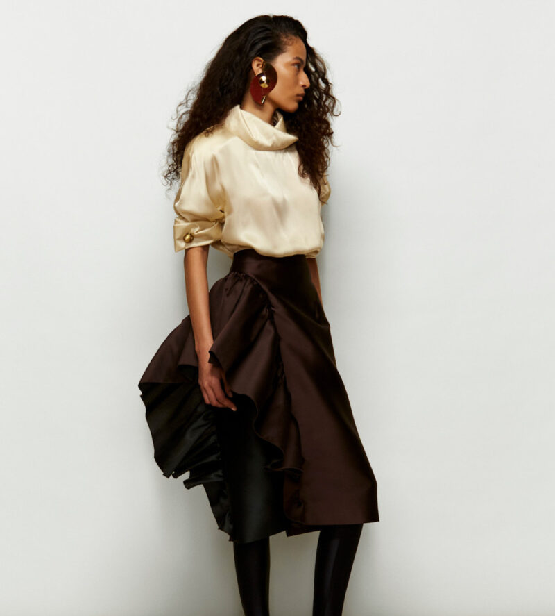 Цветовая палитра погружает в чарующую атмосферу вечернего Парижа. Глубокий кофейный, насыщенный черный и выразительный красный оттенки дополнены неожиданными всплесками розового и изумрудного — они усиливают игру фактур и подчеркивают движение тканей.