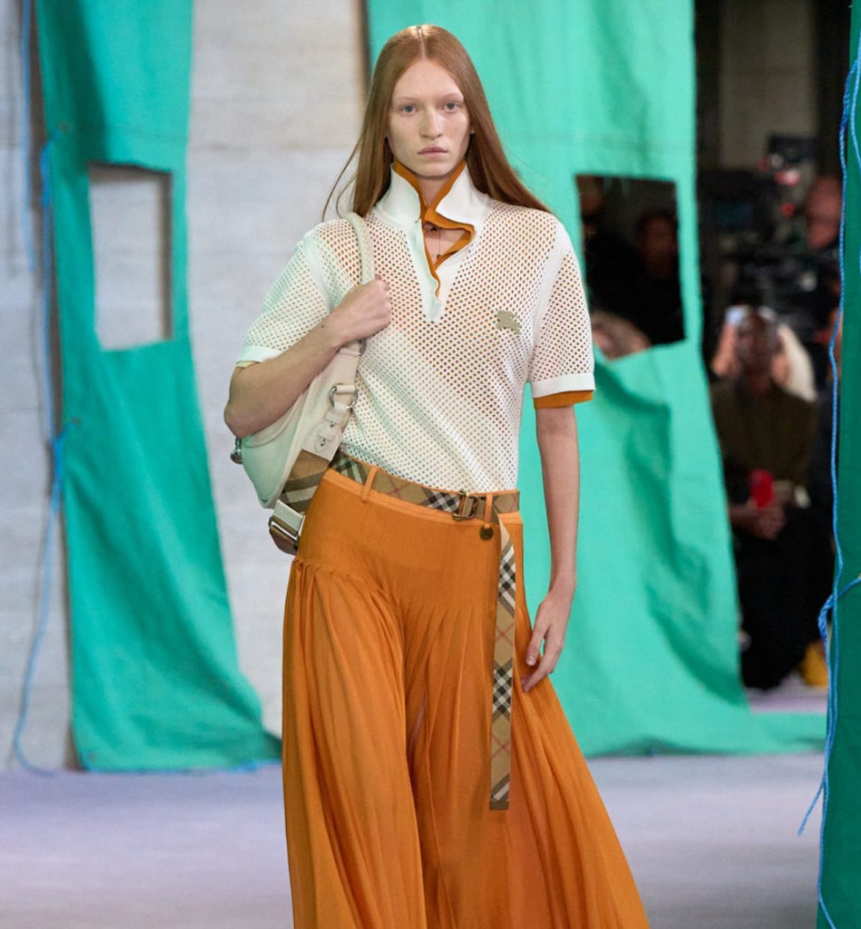 Цветовая палитра варьировалась от приглушенных бежевых и серых тонов до ярких акцентов морковного и сиреневого. Ли искал баланс между нейтральными и игривыми оттенками, стремясь к тому, чтобы каждый образ выглядел свежо и радостно. Важно отметить, что фирменная клетка Burberry также нашла свое место — в виде тонких шарфов и ремней, тем самым оставаясь ненавязчивой, но узнаваемой деталью.