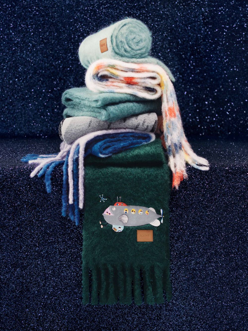 Loewe представил праздничное оформление флагманского бутика в Мадриде. Фасад здания был окрашен в глубокий синий цвет, который отсылает к таинственным глубинам океана, и украшен яркими персонажами из фантастических подводных миров, созданных японской мастерской Suna Fujita.