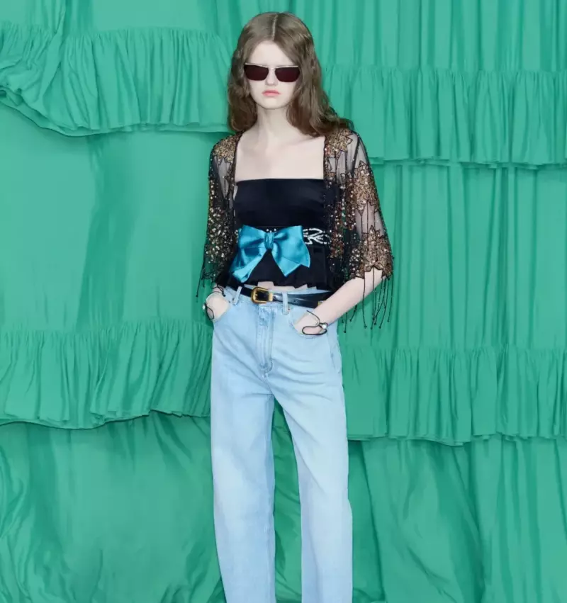 Коллекция включает 62 женских и 28 мужских образов, вдохновленных модой двух ключевых эпох. Дух 60-х годов прослеживается в трапециевидных мини-платьях, строгих костюмах и шелковых рубашках с вишневыми принтами, напоминающих о светском шарме того периода. В то же время, элементы бохо 70-х — длинные юбки с оборками, кафтаны с кристальными вышивками и пояса с изображением бабочек или бантиками — привносят в коллекцию атмосферу свободы и неформальности.