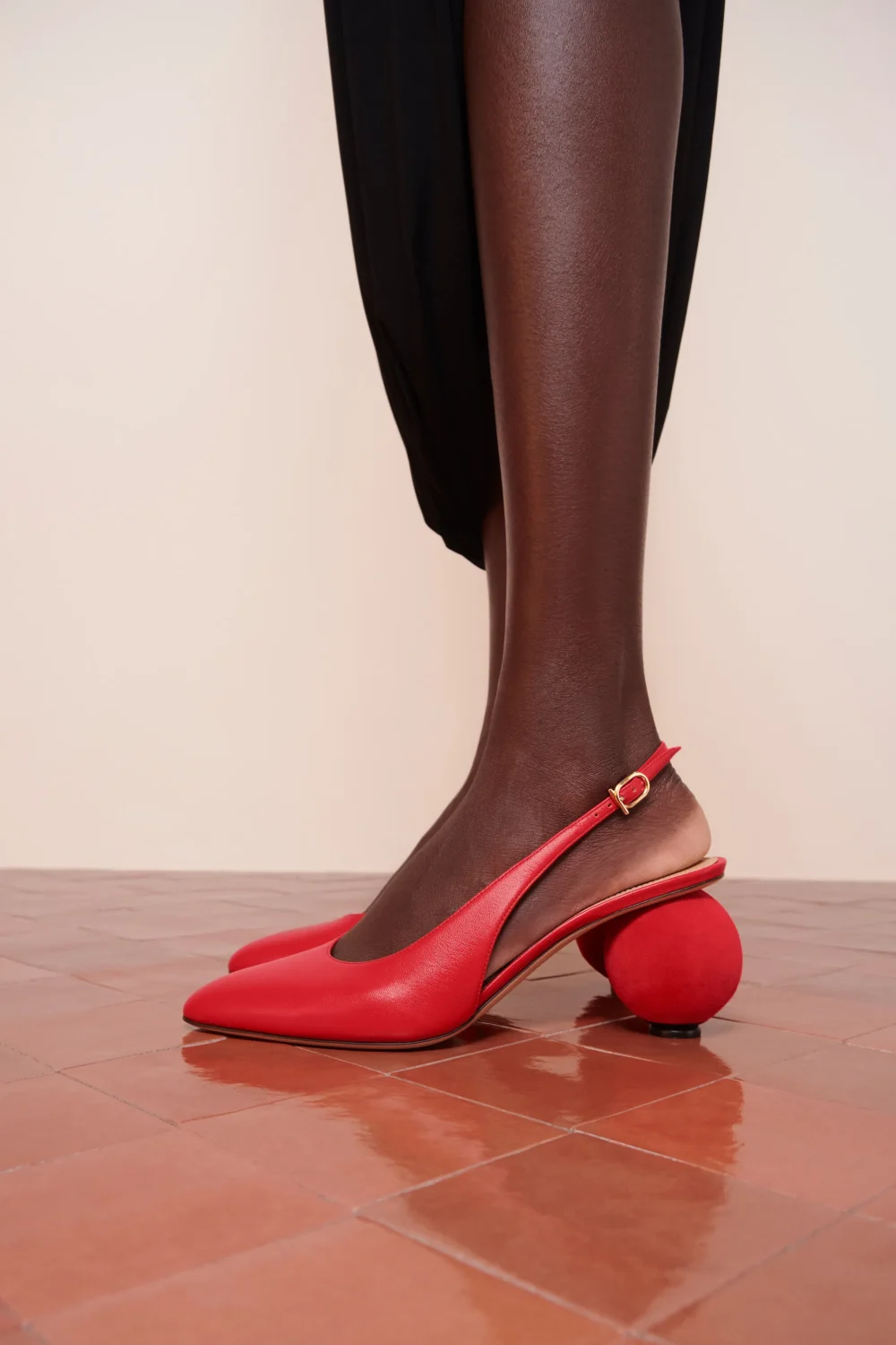 Одной из отличительных черт работы Максимилиана Дэвиса является использование техники scarf dressing, которая привносит в одежду плавность и динамичность. В коллекции Pre-Fall 2025 эта концепция получила новые трактовки. Ярким примером является платье с асимметричным подолом: его красный лиф плавно переходит в черную юбку из мягкого драпированного джерси.