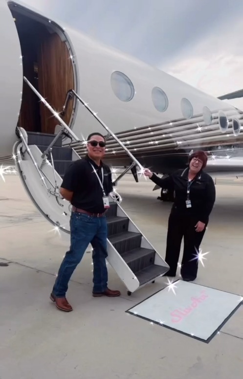 Звезда погружается в атмосферу гламура уже в самом начале: у трапа самолета расположен розово-белый коврик с надписью Sliv Air. Внутри салона, выполненного в пастельных тонах с обилием розового декора, расположены кожаные кресла, оснащенные мягкими подставками для ног, а также три просторные кровати с подушками и пледами. Около них красуются бутылки Fiji, маски для глаз и буфет с разнообразными угощениями, в числе которых чипсы, сырная нарезка и свежие овощи, — идеальный набор для того, чтобы расслабиться и восстановиться во время перелета!