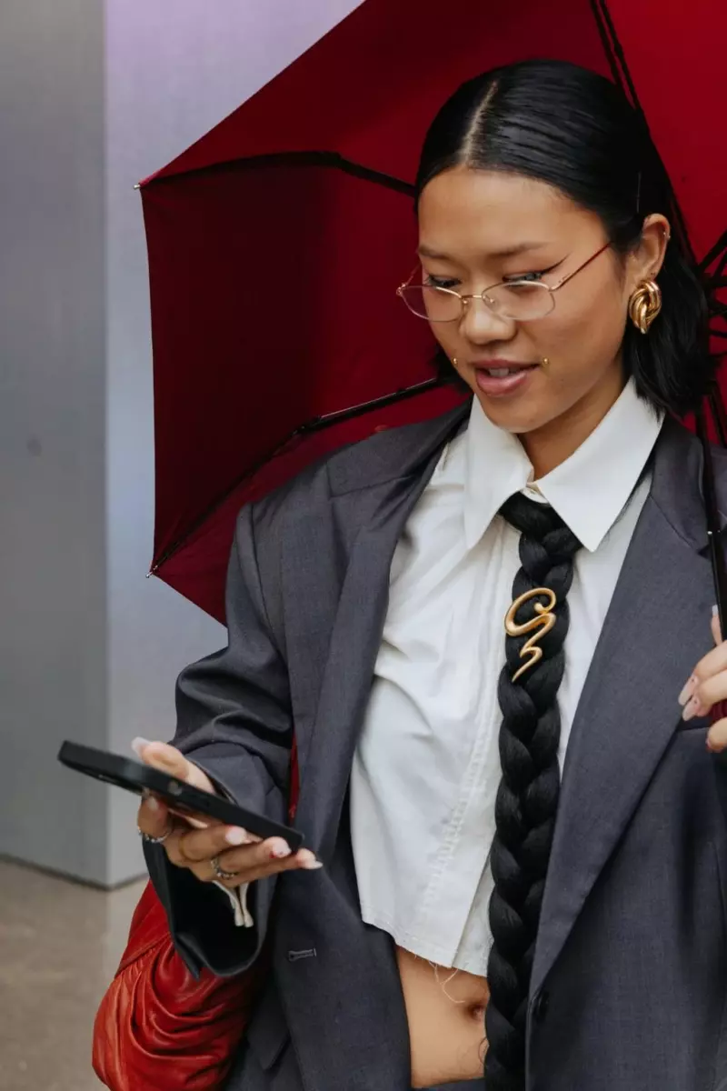 Зажатый между лацканами пиджаков, пальто и жакетов всех видов, этот традиционно формальный аксессуар может показаться неуместным на фоне ярких современных нарядов гостей Недели моды. Но именно галстуки (позвольте скаламбуру) соединили ансамбли этого года. От черных узких вариантов до шелковых с узорами и даже одной сделанной из плетеных волос, — галстуки стали завершающей и весьма интересной деталью в образах.