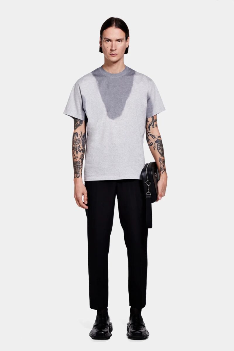 Описание этой вещи предельно ясно: «Футболка прямого кроя с напечатанными на ней пятнами пота». Однако, по словам дизайнера, не все так просто. «Мы хотели задаться вопросом об эротическом измерении тела и клейме сексуальности. Это история тела, которое живет», — заявляет он.