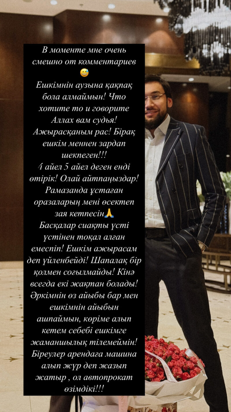 «Ешкімнің аузына қақпақ бола алмаймын. Ажырасқаным рас. Бірақ ешкім менен зардап шекпеген. 4-5 әйел алды деген өтірік. Олай айтпаңыздар. Рамазанда ұстаған оразаларыңыз мені өсектеп зая кетпесін. Басқалар сияқты үсті-үстіне тоқал алған емеспін. Ешкім ажырасамын деп үйленбейді. Әркімнің өз айыбы бар. Біреулер жалға көлік алып жүр деп жазып жатыр, ол өзімдікі»,