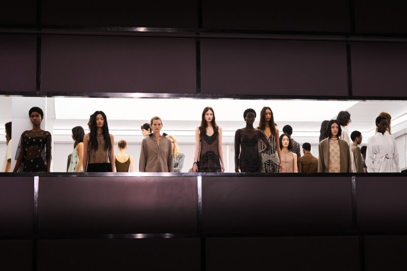 Коллекция демонстрирует характерные силуэты 1920-х годов — заниженные талии, бахрома, хрустальные украшения, плавно переходящие в более строгие формы 1940-х годов, с приталенными юбками и пальто землистых тонов. Несмотря на простоту их кроя, каждый элемент воплощал мастерство и тонкость, ставшие визитной карточкой Fendi. К примеру, простое, казалось бы, платье-футболка было выполнено из замшевого крокодила и переливалось под прожекторами, когда модели прогуливались по периметру огромного подиума в Superstudio Maxi Milano.