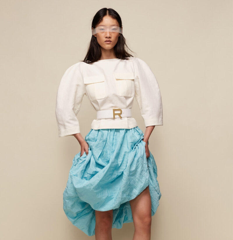 Акценты коллекции сосредоточены на аксессуарах: ротанговые мотивы, бахрома и плетеная кожа украшают сандалии и мюли, придавая образам нотку расслабленного прибрежного шика, а монограмма «R», выполненная в золоте, — ремни.