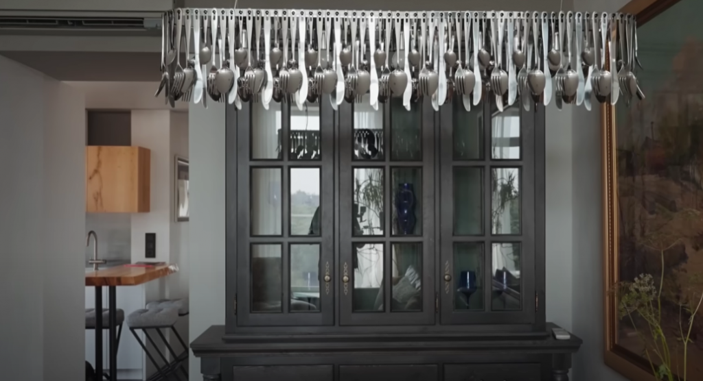 На кухне можно увидеть обилие тумбочек, все необходимые бытовые приборы. Рядом находится столовая с креативным светильником, созданным из ножей, ложек и вилок. В комнатах расположены мягкие удобные диваны. Для уюта на стенах развешены картины, на полках стоят декоративные аксессуары.