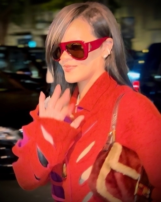 В этот раз певица вновь решила выбрать монохромный образ в красном цвете, но сейчас предпочла его более яркий оттенок. Рианна надела винтажные пальто Christian Dior 2002 года с множеством вырезов. Певица решила сделать этот айтем главным акцентом образа, поэтому надела его практически на голое тело. Дополнить тотал-красный аутфит звезда решила солнцезащитными очками The Attico и сумкой Fendi.