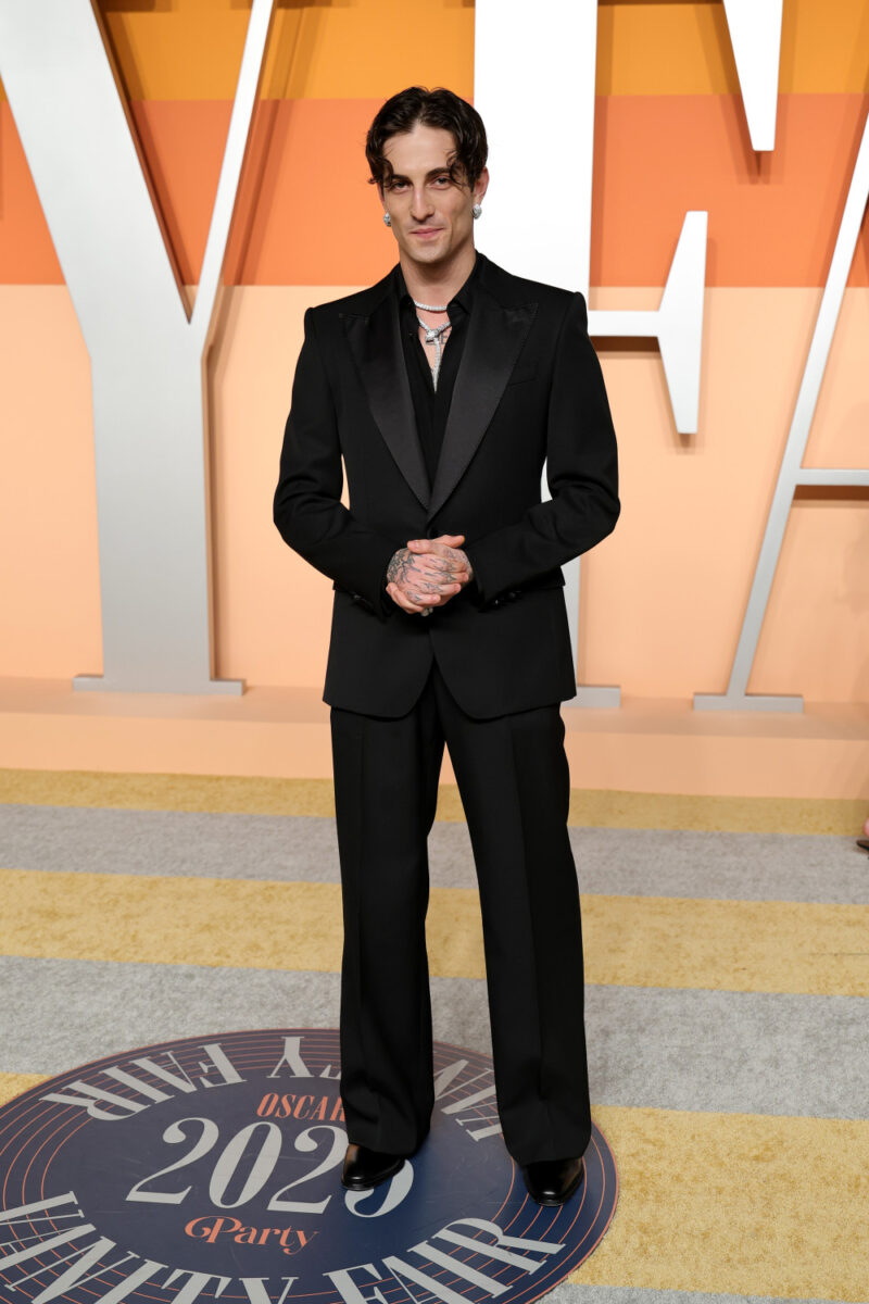 Дамиано Давид, известный своим смелым стилем, отдал предпочтение эффектным украшениям. Его выбор пал на колье из белого золота с двумя бриллиантами грушевидной огранки, серьги Serpenti из желтого и белого золота с 36 бриллиантами огранки «маркиз», а также кольцо Serpenti. Этот ансамбль идеально отразил его харизматичность и эксцентричность.